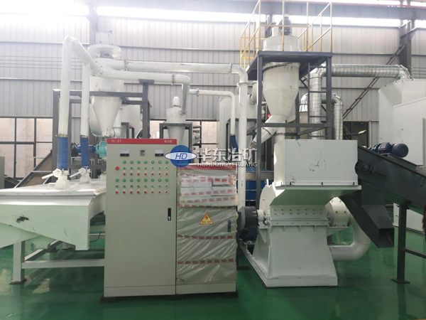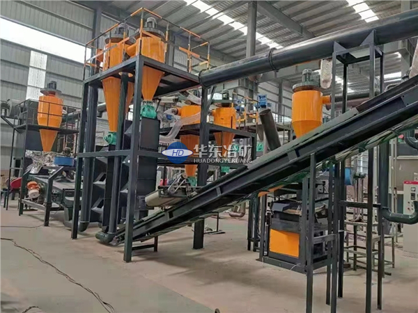 報廢鋰電池由輸送機送入一級撕碎機中進行撕碎,撕碎后的物料通過輸送機送入二級多刀破碎機中進行第二次破碎,二次破碎后的物料進入到輸送機中同時設置磁選設備,可以將物料中的鐵分選出來。分選后的物料經輸送機送入氣流分選機,通過引風機和旋風下料器把正負極中的隔膜紙分離出來,把分選后的正負極片進入到三級粉碎機中進行細碎,將物料粉碎到20目左右。粉碎后的物料由負壓系統進入到旋風分離器中進行粉塵過濾,并通過兩次氣流分選,使不同密度的物質進行分層,然后得到正負極材料與銅、鋁、鎳等材料,而所有的超細粉塵由負壓系統帶入脈沖除塵器中進行收集。而過濾得到的尾氣將繼續由負壓系統送入到尾氣處理設備中進行空氣凈化,使之達到國家排放標準后再進行高空排放。
